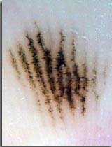 Lorsque se développe un mélanome plantaire cette alternance bandes larges blanches-bandes étroites pigmentées s’inverse. Les bandes pigmentées deviennent plus larges que les bandes blanches : ceci est lié à la migration des cellules mélaniques le long de jonction dermo-épidermique.