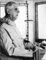 Illustration : le général De Gaulle, en tenue anti-radiation assistant à la passerelle d'un croiseur à un essai nucléaire français dans le pacifique.