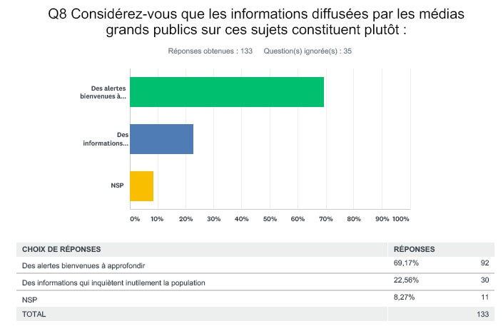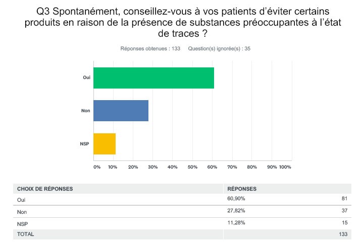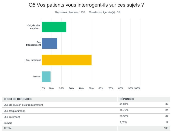 Une sollicitation pour répondre à une enquête composée de quatorze questions a été adressée au début du mois de décembre à 30 000 médecins et pharmaciens. Outre les médecins généralistes (10 000 praticiens), certaines spécialités avaient été ciblées en particulier en raison de leur proximité avec le sujet : allergologues (947), biologistes (1 780), dermatologues (2 328), endocrinologues (1 361), gynécologues (2 654) et pédiatres (autour de 5 000). Quatre cent soixante-dix-sept praticiens ont accepté de répondre au questionnaire, ce qui représente un taux de réponse signalant un intérêt certain pour le sujet, si l’on en juge par rapport aux autres enquêtes comparables réalisées par le JIM. Si pour certaines spécialités, le nombre de répondeurs demeure trop faible pour assurer la parfaite significativité des résultats, ces derniers offrent néanmoins une grille de lecture intéressante, notamment parce que certaines majorités sont très marquées. Les questions avaient été élaborées en s’appuyant sur nos constatations et les premiers travaux de notre groupe de travail. Il s’agissait notamment de déterminer le niveau d’inquiétude de professionnels de santé, d’évaluer leur connaissance sur le sujet et d’appréhender leur attitude vis-à-vis de leurs patients sur cette thématique.Nous avions également pour souci de proposer des questions pouvant faire écho à une enquête parallèle conduite auprès du grand public.