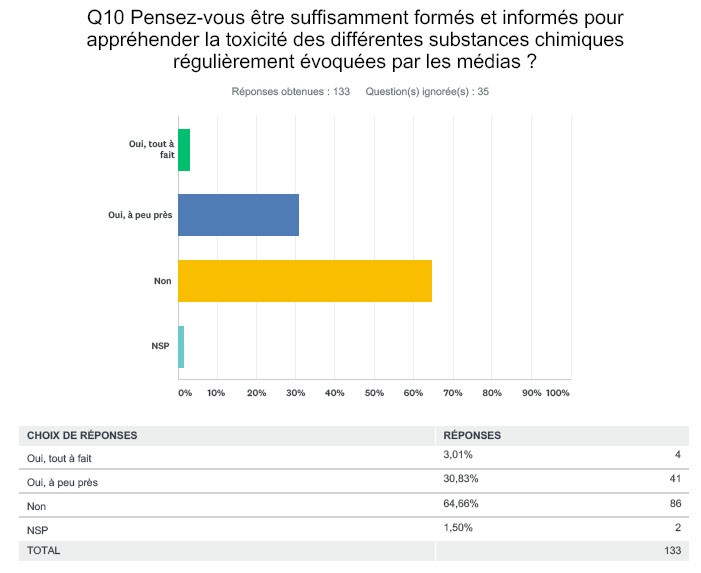 Face à un sujet qui semble donc constituer une préoccupation importante pour les praticiens, ces derniers se sentiraient insuffisamment « formés ou informés pour appréhender la toxicité des différentes substances chimiques ». Ils seraient à peine 5 % à s’estimer « tout à fait » formés ou informés, quand 29 % considèreraient l’être à peu près et que 64 % répondent négativement à cette question (2 % ne se prononcent pas). Recevant une formation initiale un peu plus développée sur ces questions, les pharmaciens seraient 8 % à se déclarer « tout à fait » formés. Les allergologues seraient les spécialistes qui seraient les moins enclins à s’estimer mal ou pas formés sur ces sujets (45 %) et les endocrinologues les plus enclins à s’estimer mal ou pas formés (71 %). On notera que ceux qui semblent se considérer comme les mieux armés seraient également ceux qui ont le moins tendance à qualifier de « disproportionnées » les inquiétudes des patients.