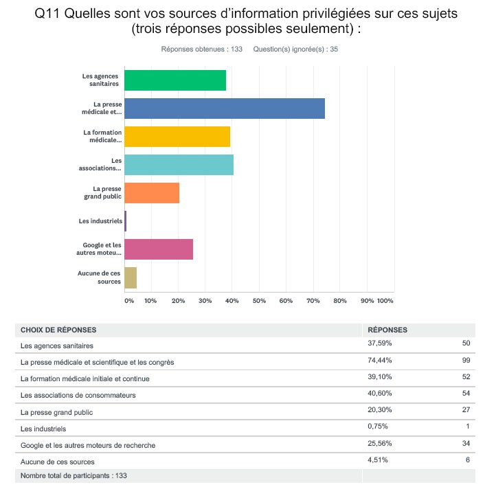Les sources étant multiples sur ce sujet (ce qui explique également la diversité de la qualité de l’information), l’enquête a voulu déterminer celles qui étaient privilégiées par les médecins et pharmaciens parmi les agences sanitaires, la presse médicale et scientifique et les congrès, la formation médicale initiale et continue, les associations de consommateurs, la presse grand public, les industriels, Google et les autres moteurs de recherche. Alors que les participants ne pouvaient donner que trois réponses, le surprenant trio de tête se compose de la presse médicale et scientifique et les congrès (33 %), les associations de consommateurs (17 %) et les agences sanitaires (17 %). Ces trois pôles devanceraient la formation médicale continue (14 %), la presse grand public (9 %), Google et les autres moteurs de recherche (9 %) et les industriels (moins de 1%). On soulignera que 0,7 % des praticiens indiquent n’utiliser aucune de ces sources. Les agences sanitaires constitueraient la deuxième source d’information des pharmaciens, devant les associations de consommateurs (et non à égalité avec les associations de consommateurs). Néanmoins, on ne retrouve pas significativement de défiance vis-à-vis des associations de consommateurs au sein des spécialités pouvant être plus enclines à regarder les inquiétudes des patients comme disproportionnées.