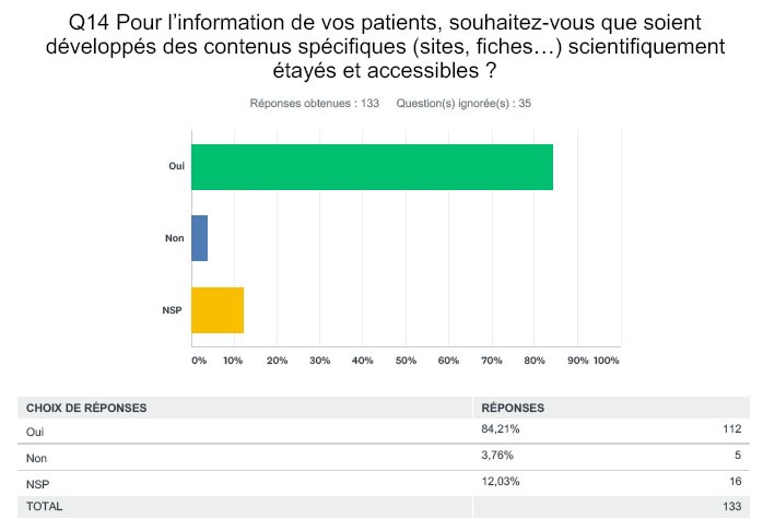 Enfin, outre leur propre information, les médecins et pharmaciens ont été interrogés sur celle de leurs patients. Ils seraient ainsi une large majorité (88 % chez les médecins et 92 % chez les pharmaciens) à plébisciter l’idée de développer des contenus spécifiques scientifiquement étayés et accessibles sur ces sujets, tandis que 4 % (6 % chez les pharmaciens) ne goûteraient guère un tel projet et que 4 % (3 % chez les pharmaciens) ne se sont pas prononcés.