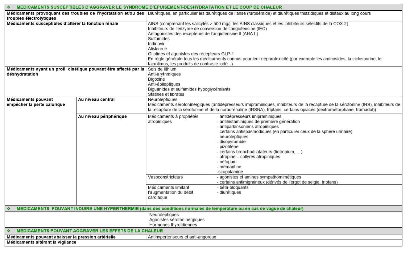 Au-delà de ces médicaments pour lesquels il existe un niveau de preuve élevé de leur nocivité potentielle en cas de hausse des températures, l’ANSM rappelle que « d’un point de vue théorique, sur la base de leurs propriétés pharmacodynamiques et de leur profil pharmacocinétique, un certain nombre de médicaments doivent être pris en considération dans l’analyse des facteurs de risque chez les sujets susceptibles d'une moindre adaptation à la chaleur ». Aussi, une liste complète de ces spécialités a été constituée par l’ANSM.
