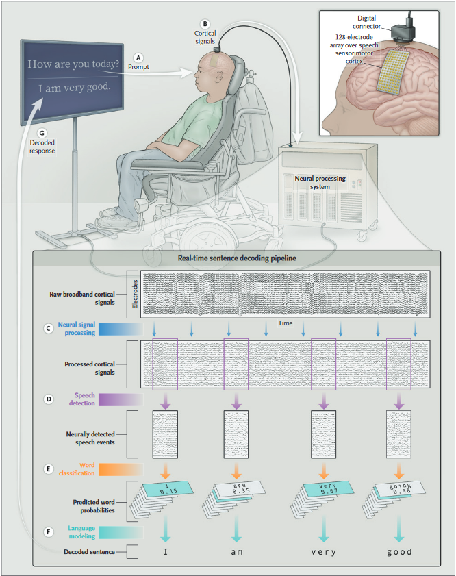 Le décodage des signaux électriques neuronaux du cortex sensorimoteur émis lors des tentatives de langage est-il possible et exploitable ? C’est ce que suggèrent les résultats obtenus chez un patient atteint d’une anarthrie associée à une tétraparésie spastique résultant d’un accident vasculaire du tronc cérébral. Un implant réseau de haute densité d'électrodes intracorticales a été mis en place par voie sous-durale au niveau du centre du langage. Quarante-huit séances d’une demi-heure environ chacune ont permis au patient de tenter d’articuler une cinquantaine de mots, ce qui correspond à 22 heures d’enregistrement. Les données ainsi recueillies ont été traitées au moyen d’algorithmes dérivés de l’apprentissage profond qui ont permis d’établir des corrélations entre l’activité cérébrale et la détection/classification des mots.98 % des tentatives de production des mots individuels identifiée avec succès