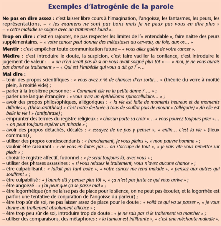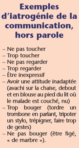 Mal communiquer peut générer du mal au sens du mal-être. Nous donnons ci-après quelques exemples de communication iatrogène (encadrés).