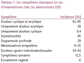 Les adolescentes peuvent consulter pour une douleur pelvienne acyclique aussi bien que cyclique, contrairement aux femmes adultes qui consultent classiquement pour une douleur cyclique (7). D’autres symptômes souvent présents sont une dysménorrhée, des saignements anormaux accompagnés d’une douleur à type de crampe et une dyspareunie profonde. Des symptômes vésicaux comme la dysurie, l’urgence mictionnelle, l’hématurie et des symptômes gastro-intestinaux tels que douleur abdominale, nausées, diarrhée et constipation, douleur rectale, hémorragie rectale, dyschésie cyclique, peuvent également se produire (6, 7). Les symptômes douloureux sont souvent suffisamment sévères pour avoir des implications sociales comme l’absentéisme scolaire et l’incapacité d’exercer d’autres activités. Un point important est que les adolescentes consultent rarement avec la triade classique dysménorrhée - dyspareunie - infertilité. On enregistre une incidence élevée d’endométriose chez les adolescentes présentant une douleur cyclique, en particulier lorsque cette douleur irradie vers le dos ou les membres inférieurs, ou lorsqu’elle s’accompagne de symptômes gastro-intestinaux (6, 19). Les endométriomes ovariens sont rares avant l’âge de 25 ans (19). Une vue d’ensemble est présentée au tableau 1 (20).