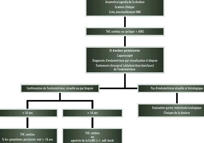 Chez les patientes chez lesquelles la douleur persiste après trois mois de traitement d’essai, une évaluation supplémentaire est indiquée dans le cadre de l’endométriose. Une laparoscopie est indispensable pour diagnostiquer l’endométriose, c’est l’examen de référence. Cette procédure peut être réalisée en toute sécurité chez l’adolescente. Les gynécologues qui pratiquent une laparoscopie chez des adolescentes présentant une douleur pelvienne doivent être familiarisés avec les lésions atypiques de l’endométriose chez les adolescentes, lésions qui sont plutôt rouges, claires ou blanches, contrairement aux lésions chocolat des adultes (21). La meilleure classification du degré d’endométriose est la Revised American Society of Reproductive Medicine Classification of Endometriosis (19, 21, 23). Chez les adolescentes, il est important de tenir compte du résultat cosmétique lorsqu’on pratique des incisions pendant l’intervention. Au moment de la laparoscopie diagnostique, on doit pouvoir réaliser simultanément un traitement chirurgical, pour éviter que la patiente ne doive inutilement subir deux opérations différentes sous anesthésie générale (19). L’ablation des lésions par électrochirurgie ou laser, ou résection de l’endométriose, se pratique donc de préférence au moment de la laparoscopie diagnostique (24). Le but du traitement chez l’adolescente est la répression de la douleur, la prévention de la progression de l’endométriose et la préservation de la fertilité, comme cela est expliqué à la figure 1. Une approche globale, tenant compte de la prévention de la douleur, de l’infertilité et de la rechute de l’endométriose sera de préférence définie dès le moment du diagnostic et jusqu’à ce que le désir d’enfant ait été satisfait (21). Les détails relatifs à ce traitement médicamenteux poursuivi sont brièvement résumés à la figure 1 et n’entrent pas dans le cadre de cet article.