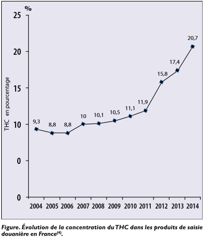 L’autre évolution majeure réside dans l’augmentation des concentrations en principe actif ou D9tétrahydrocannabinol (THC) de l’herbe et de la résine (20,7 % en 2014 versus 9,3 % en 2004 en France)(4). L’impact sanitaire de ces tendances – de consommation, concentration, banalisation de son usage (effet de sa dépénalisation dans certains pays), du cannabis thérapeutique, de la diversification de produits comestibles en contenant et accessibles par internet – est encore mal documenté, notamment chez les jeunes enfants.