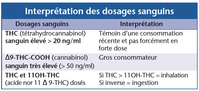 C’est la référence pour affirmer qu’il ne s’agit pas d’un faux positif en dépistage urinaire. La fenêtre de détection est de 6 heures si l’exposition est aiguë et > 6 heures chez un gros consommateur. La concentration sanguine n’est pas corrélée à l’imprégnation tissulaire.