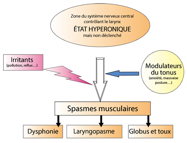 Figure 1. Modélisation du « larynx irritable » proposée par Morrison et coll. (1999). La zone du système nerveux central contrôlant le larynx est dans un état de base hypertonique, hyper-réactif mais non déclenché. Des facteurs agissant par le biais du tonus musculaire global vont moduler la réactivité du système et des facteurs irritants vont alors intervenir comme déclencheurs.