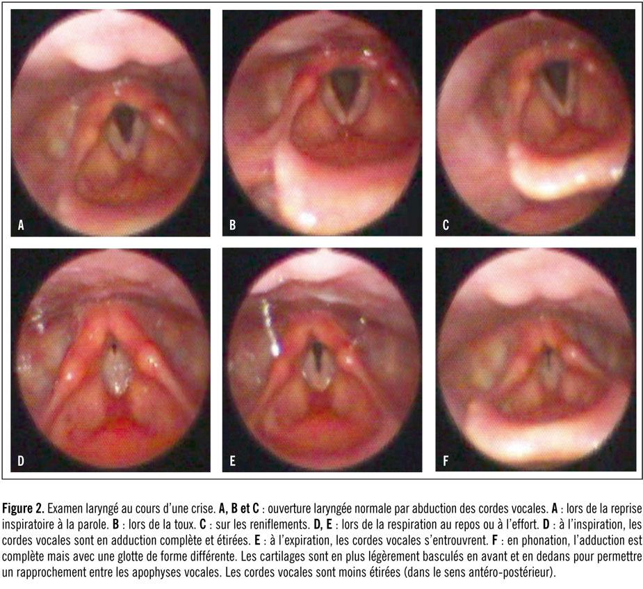 Le diagnostic est assuré au mieux par l‘examen du pharyngolarynx chez un patient en crise permettant la visualisation du mouvement paradoxal. En dehors des crises, la sensibilité à cet examen sera majorée par des manœuvres de provocation (respiration forcée et/ou rapide, répétition de phonèmes, efforts à glotte fermée répétés rapidement, etc.). L’observation d’un mouvement d’adduction paradoxal à l’inspiration permettra alors de poser le diagnostic (Andrianopoulos et coll., 2000) (figure 2). La dynamique laryngée est normale dans les autres situations fonctionnelles du larynx (phonation, toux, etc.). En dehors de la crise, ce même examen permettra dans tous les cas d’éliminer une cause organique ORL. De la même manière, un examen pneumologique permettra de préciser l’association ou non à une pathologie pulmonaire. Des explorations fonctionnelles préciseront notamment la présence d’une hyper-réactivité bronchique (test à la méthacholine) et d’un asthme.