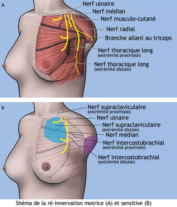 Au plan moteur, les extrémités des nerfs musculo-cutané, médian, ulnaire (cubital) et radial ont été disséqués et anastomosés en termino-terminal avec les nerfs moteurs innervant les chefs claviculaires et sternaux du grand pectoral et le muscle serratus antérieur.