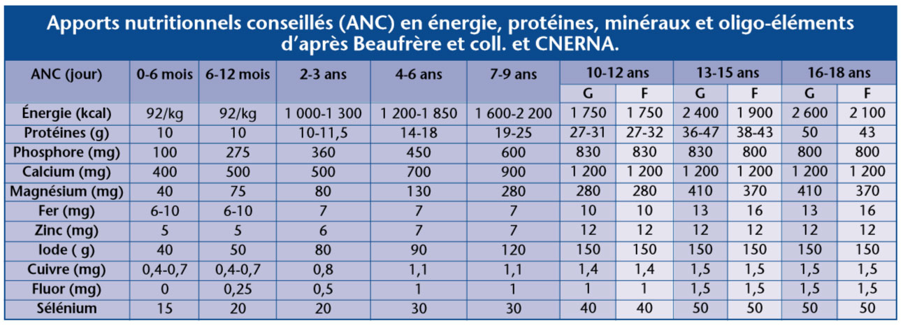 Le lait et les produits laitiers représentent la principale source d’apport calcique pour l’enfant et l’adolescent. Les besoins en calcium sont particulièrement importants dans une période de construction du squelette. Le lait constitue un vecteur favorable à l’absorption du calcium comparé à d’autres sources (absorption favorisée par le lactose). Les apports recommandés en calcium sont définis par l’ANAES (2001) et résumés dans le tableau. Le processus de constitution du squelette fait néanmoins intervenir d’autres facteurs comme la génétique, le statut en vitamine D (lui-même lié à l’exposition solaire) et l’exercice physique (déminéralisation liée au décubitus prolongé). Dans cet ensemble complexe, l’effet isolé de l’apport calcique est difficile à étudier. Les études d’intervention de supplémentation calcique ont permis d’améliorer la minéralisation osseuse globale. Cet effet paraît plus nettement chez les filles adolescentes ayant, au préalable, un apport calcique faible(6). Il illustre la possibilité d’une minéralisation osseuse maximale avec des apports calciques et un statut vitaminique D adéquats. Dans ce sens, les apports recommandés en calcium utilisent un nombre de portions de produits laitiers en fonction de l’âge permettant d’assurer des rations calciques suffisantes. Le régime sans lait expose l’enfant à des apports calciques insuffisants. L’exemple des enfants allergiques aux protéines de lait de vache permet de mesurer, à distance de la maladie, la diminution des apports calciques en rapport avec la diminution de consommation des produits laitiers même si l’interprétation des résultats est difficile (effet de la maladie ou du régime). Le suivi d’enfants végétariens (ovo-lacto végétariens) ou végétaliens stricts (vegan) permet de montrer l’équilibre nutritionnel satisfaisant du premier et les risques importants de carence du deuxième (carences en protéines, énergie, fer, calcium et zinc) particulièrement dangereux à l’âge pédiatrique(7).