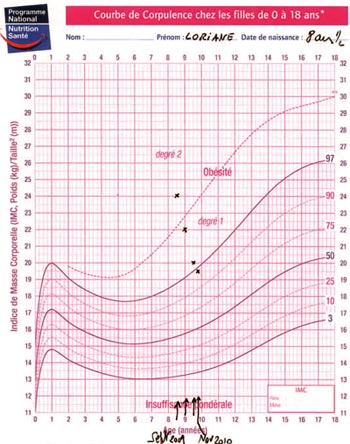 Sa soeur de 12 ans a un IMC normal. Loriane est en pleine forme, son examen clinique est normal. Mais son IMC est à 24, donc dans la zone d’obésité de degré 2 sur la courbe de corpulence. Elle travaille bien à l’école, mais semble un peu triste, mutique et au bord des larmes.