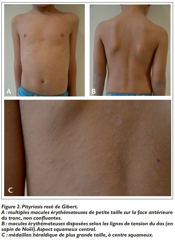Les lésions cutanées peuvent être précédées d’une phase prodromique associant sensation de malaise général, nausées, arthralgies et céphalées. L’éruption débute par l’apparition d’un « médaillon héraldique », classiquement localisé sur le tronc, dans le cou ou la racine des cuisses. Cette lésion est de plus grande taille que les autres. Elle mesure de 2 à 6 cm de grand axe. Elle est suivie 48 heures, voire plusieurs semaines plus tard par de multiples lésions similaires de petite taille, disposées selon les lignes de tension de la peau en « sapin de Noël » (figure 2).