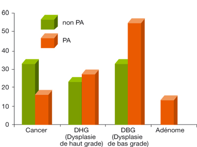 Le délai médian entre la première PA et la chirurgie était de 16 mois (1-204). Seuls 3 % des patients ayant eu une PA ont présenté une PA grave. Aucun n’en est décédé. Aucun patient n’a présenté de récidive de PA après la chirurgie. En comparant les malades opérés d’une TIPMP selon qu’ils aient présenté ou non une PA, il apparaissait que les PA sont plus fréquentes en cas d’atteinte isolée des canaux secondaires et sont associées à une dysplasie moins sévère (figure).