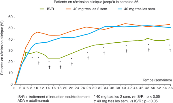 Adalimumab : efficacité supérieure du traitement régulier en injections toutes les semaines ou toutes les 2 semaines par rapport au traitement d’induction seule puis retraitement à la demande (IS/R). |