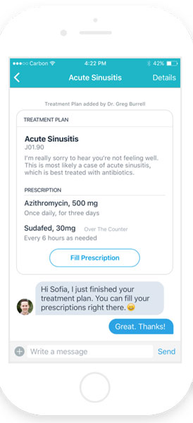 Dès la prise de rendez-vous, plus question de passer un simple coup de fil. Le patient se connecte à l’application et scanne sa carte d’assuré social. Un "chatbot" s’ouvre alors pour l’interroger sur ses symptômes et ses antécédents. Les réponses lues par le médecin permettent à ce dernier de demander des informations supplémentaires si nécessaire. Sur la base de ces différents renseignements, le praticien peut décider de délivrer immédiatement ses recommandations et de conseiller un traitement ou choisir d’examiner le patient de manière plus approfondie. Rendez-vous est alors réellement pris. La consultation est alors guidée par les informations obtenues via l’application, ce qui promet un gain de temps (?). L’ordonnance éventuellement établie peut être transmise via l’application et le patient peut même choisir de se faire livrer ses médicaments. Le logiciel offre enfin la possibilité de recevoir des alertes pour s'assurer la prise des traitements. Et le patient pourra prévenir son médecin de l’efficacité (ou non) de ces derniers.
