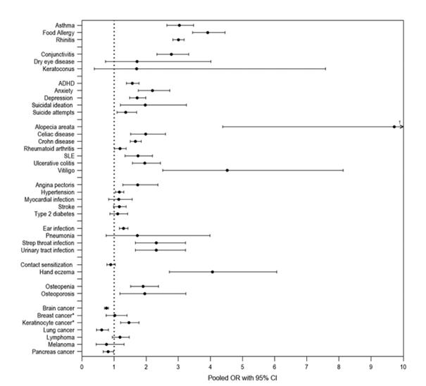 En cas le DA, le risque d'alopécie areata (AA) est multiplié par 10. D'autres maladies auto-immunes, en particulier le vitiligo, mais aussi l'urticaire chronique, la maladie cœliaque, les maladies inflammatoires de l'intestin (MII), le lupus érythémateux disséminé, la polyarthrite rhumatoïde (PR) et la maladie de Hashimoto sont également plus fréquentes chez les patients atteints de DA par rapport aux témoins (facteur d'augmentation de 1,5 à 2). Cette particularité s'explique en partie par des variantes de risque génétique partagées.
